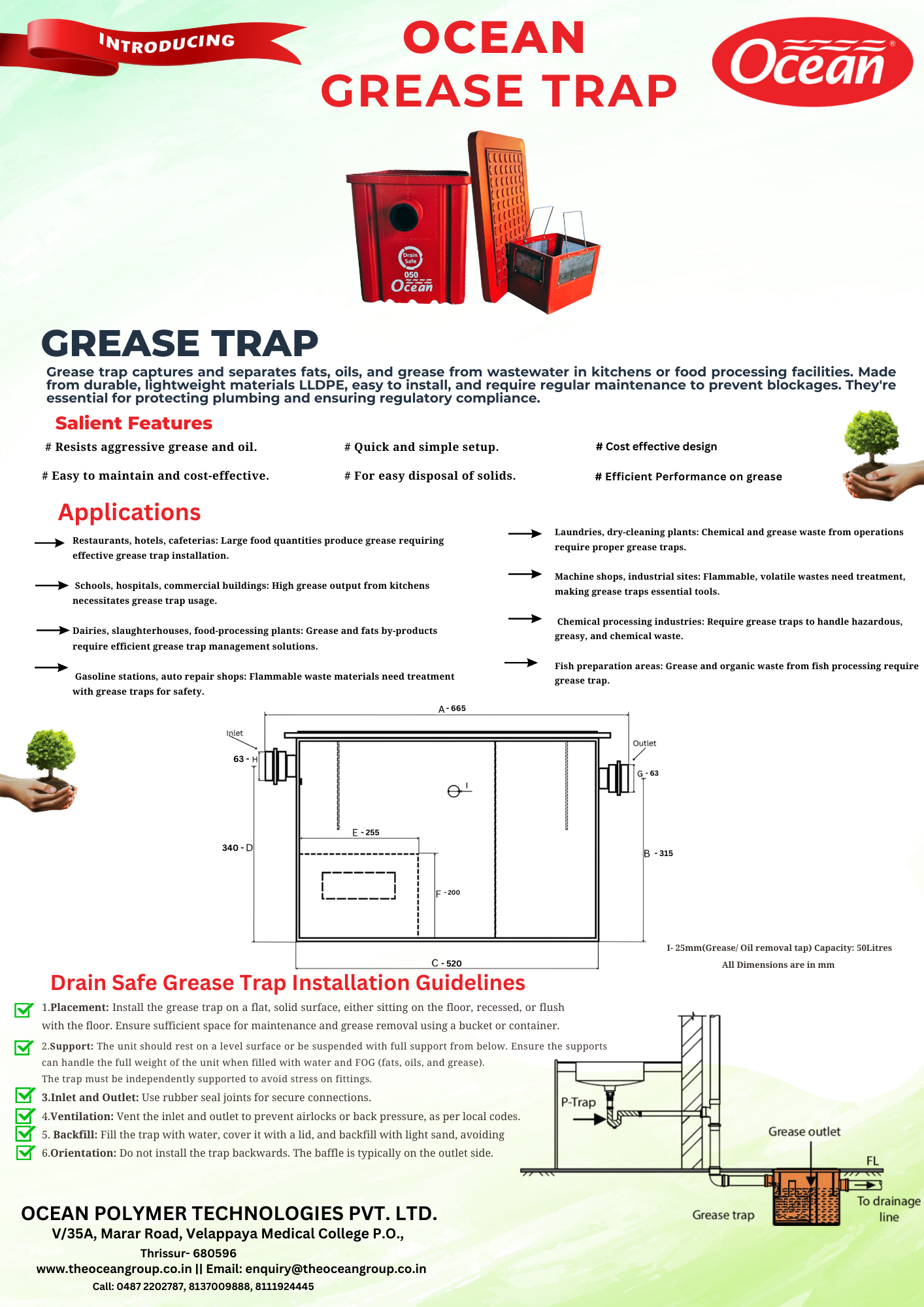 Grease Trap captures and separates fat, oils and grease from waste water in kitchens or food processing facilities. They are essential for protecting plumbing and ensuring regulatory compliances. Whether you’re using it for daily household tasks or for more complex commercial needs, selecting the right grease trap is crucial to maintaining efficiency and easy disposal of solids. Ocean Group provides a range of high-quality, durable products that cater to various requirements, offering you long-lasting and reliable solutions for all your all your waste disposal needs.